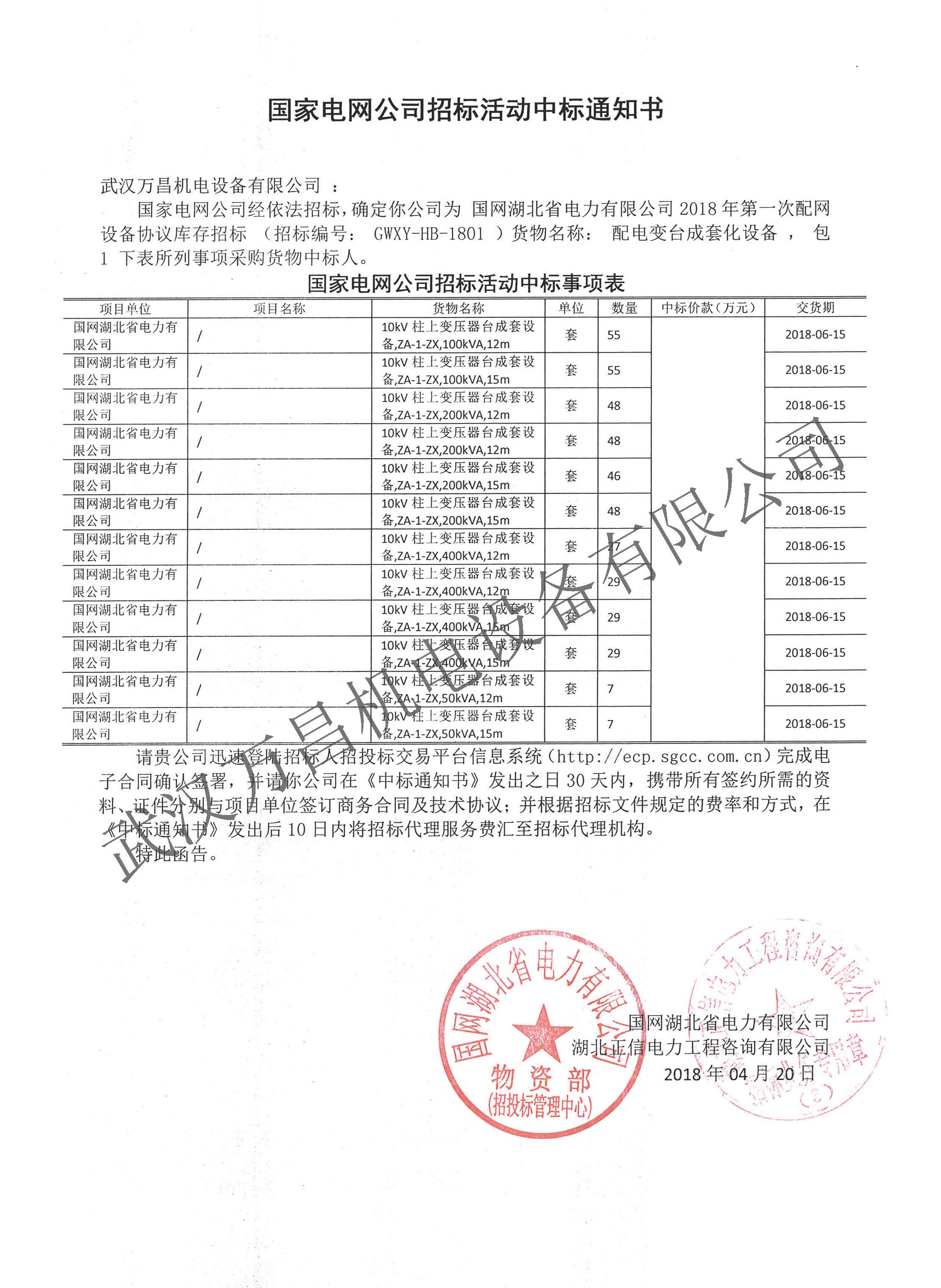 2018年中標(biāo)國網(wǎng)湖北省協(xié)議庫存項目